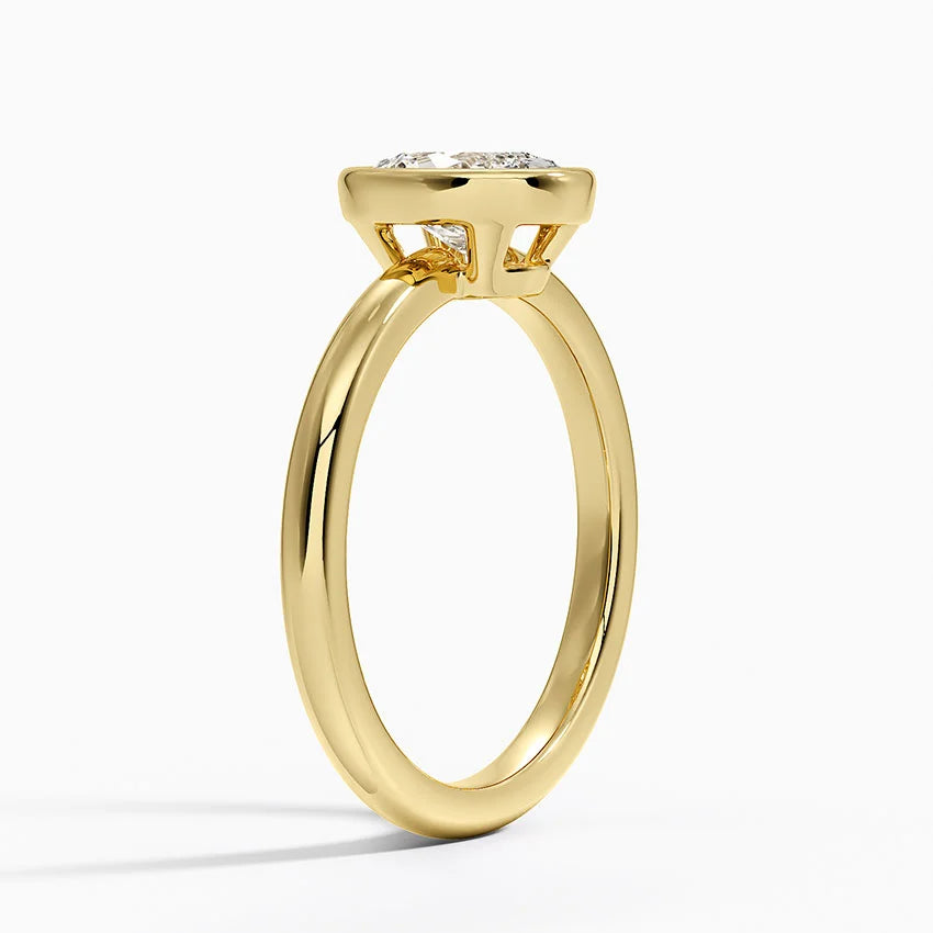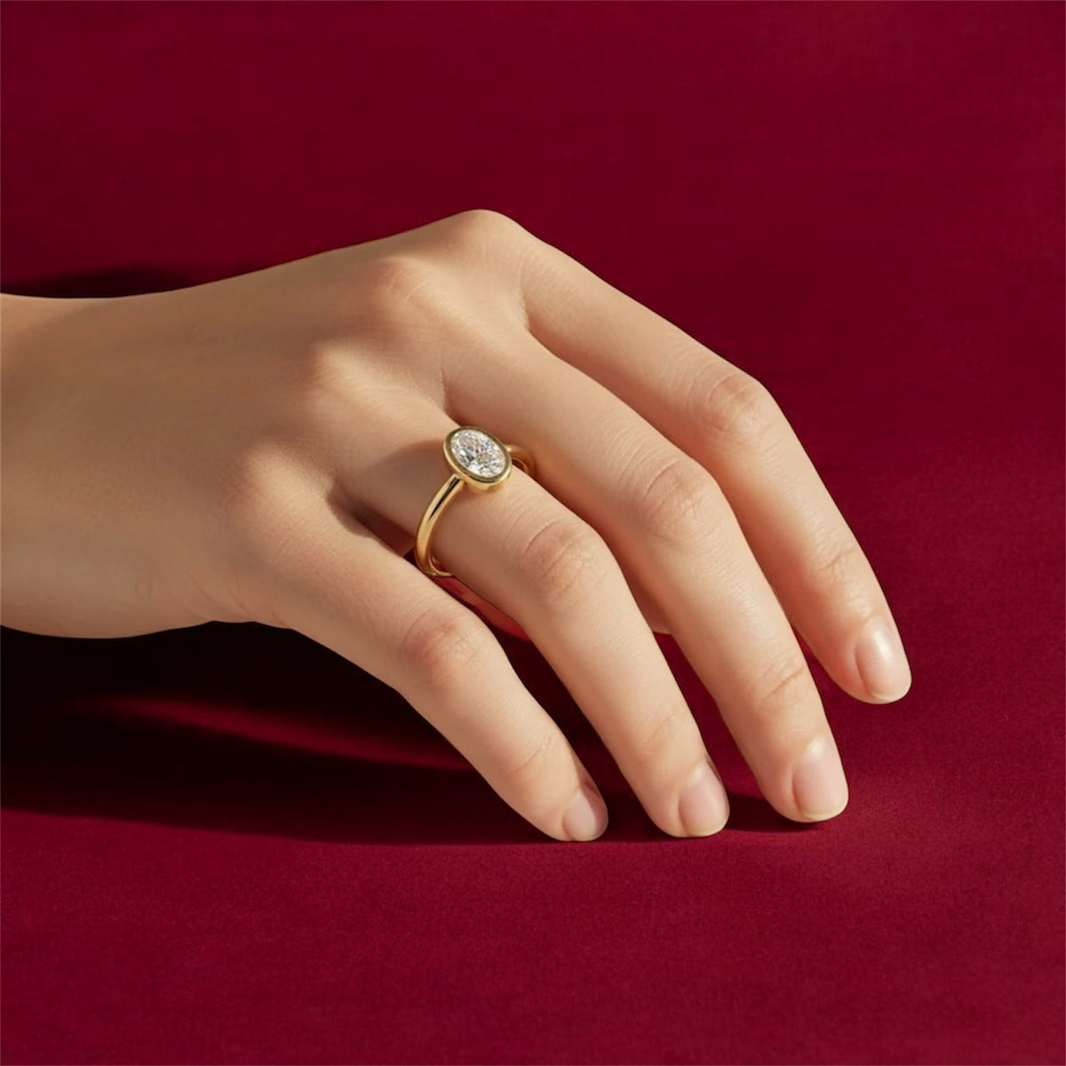 טבעת אירוסין מרשימה מבית אולטימה תכשיטים, משובצת ביהלום מעבדה בצורת אובל במשקל 1 קראט בשיבוץ בזל איכותי שמדגיש את הברק והיופי של היהלום. חיתוך האובל מעניק לטבעת נוכחות אלגנטית ויוקרתית, בעוד השיבוץ הבזל מספק בטיחות אופטימלית ושימור אסתטי לאורך שנים