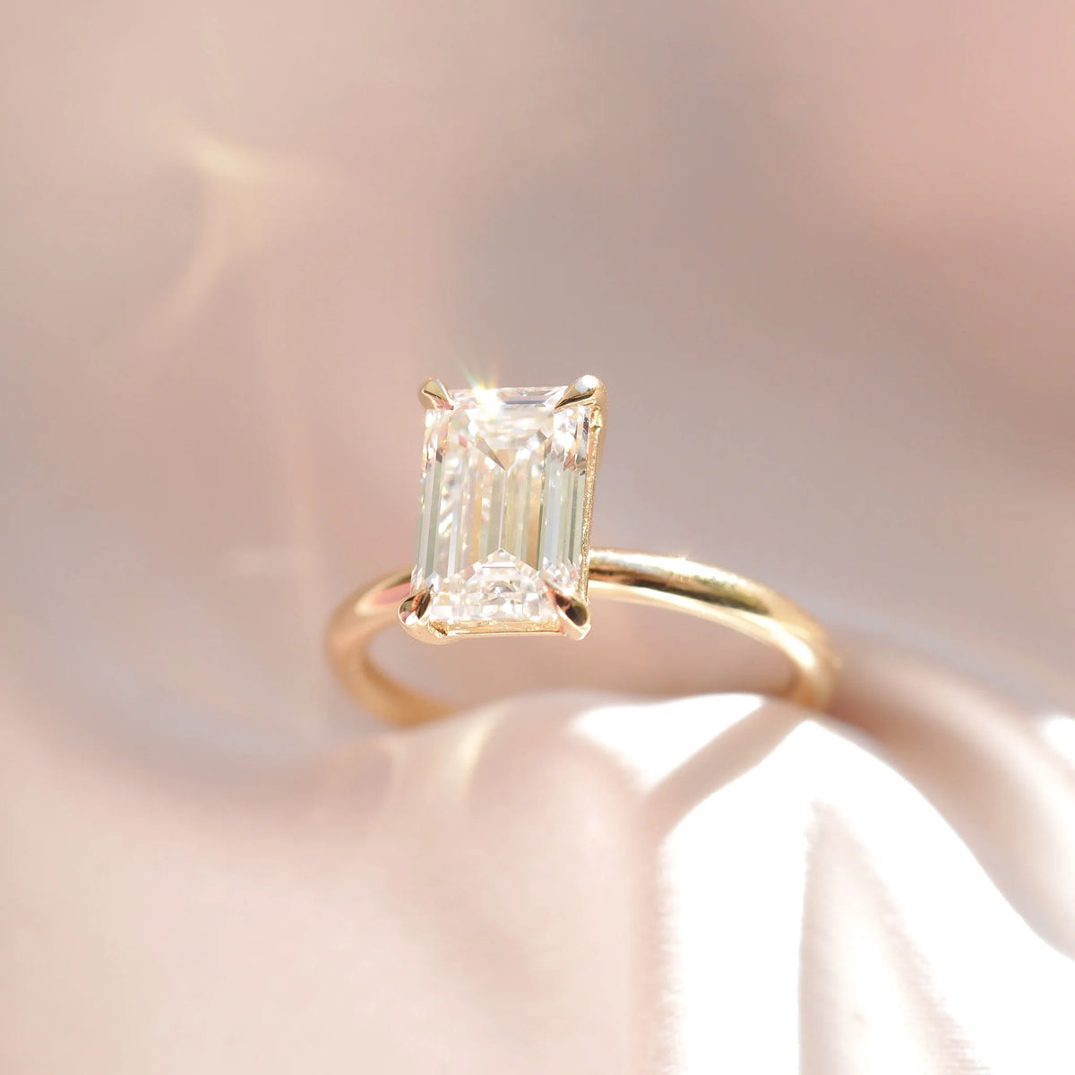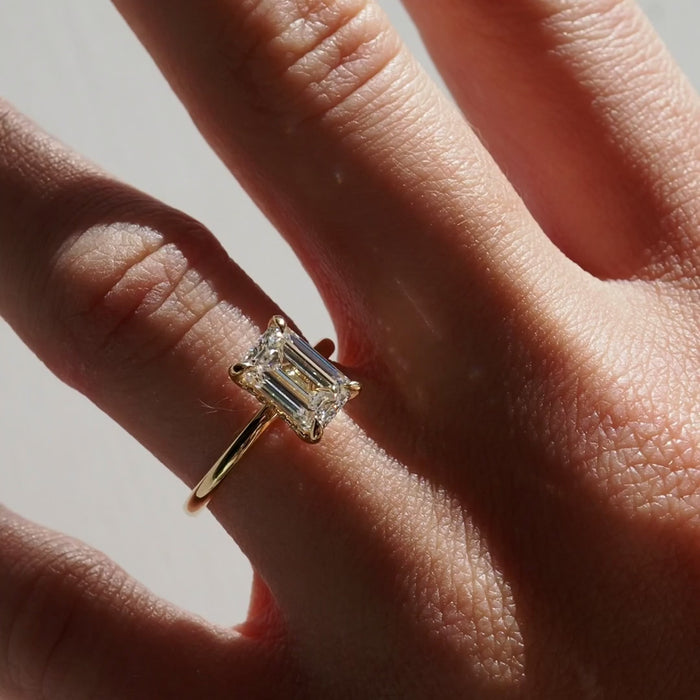טבעת אירוסין מבית אולטימה תכשיטים, משובצת ביהלום מעבדה בצורת אמרלד במשקל 2 קראט. חיתוך האמרלד הידוע בקווים הארוכים והנקיים שלו מעניק לטבעת מראה אלגנטי ומודרני בו זמנית, עם ברק עוצמתי שמושך את כל תשומת הלב.