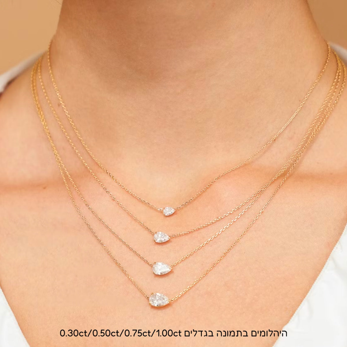שרשרת אלגנטית מבית אולטימה תכשיטים, עם יהלום מעבדה בצורת טיפה קלאסית בשיבוץ מרחף אופקי (מזרח-מערב). החיתוך האלגנטי מעניק ליהלום נצנוץ יוצא דופן ומראה רומנטי עם טוויסט מודרני.